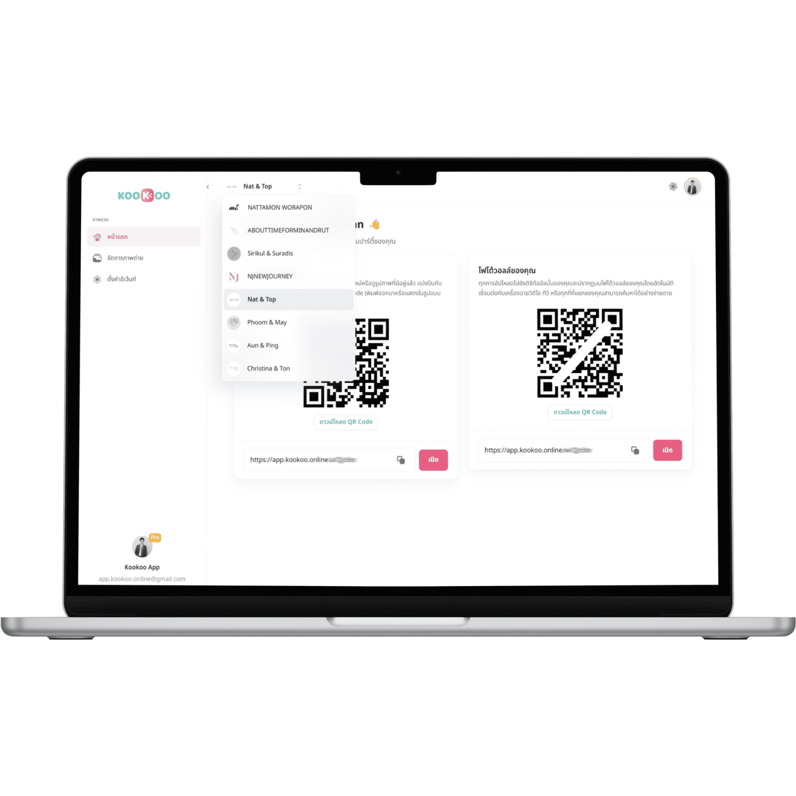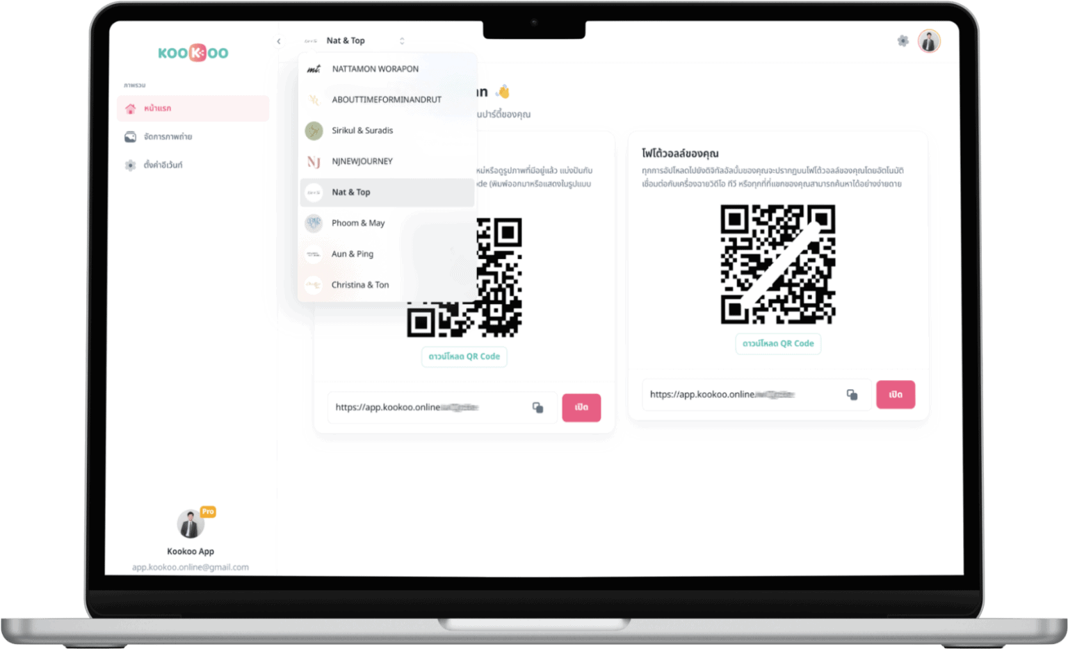 Kookoo.online เป็นระบบที่ออกแบบมาช่วยเหลือช่างภาพและออกาไนซ์ที่จัดอีเวนต์โดยเฉพาะ ที่จะทำให้การแชร์อัลบั้มภาพให้ลูกค้าผ่าน QR Code พร้อมระบบ AI สแกนใบหน้าเพื่อค้นหารูปตัวเองได้ในทันที