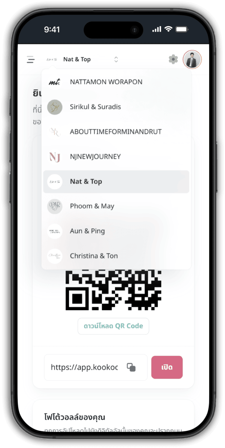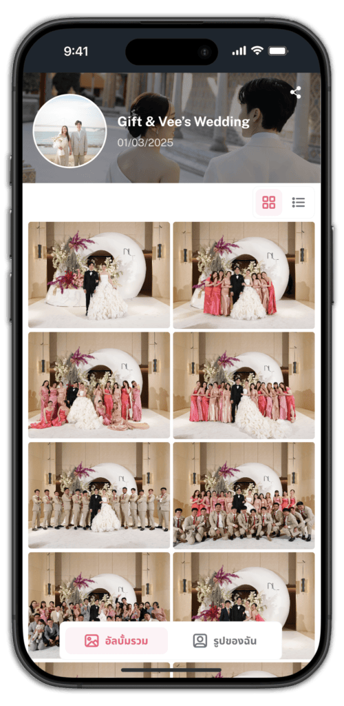 แขกในงานสามารถดูอัลบั้มงาน เพียงแค่แสกน QR Code เพื่อเข้าดูรูปและดาวน์โหลดรูปภาพได้ทันที โดยไม่ต้องลงทะเบียนใดๆ และเราสามารถเพิ่มหรือลบรูปได้ตามที่ต้องการ