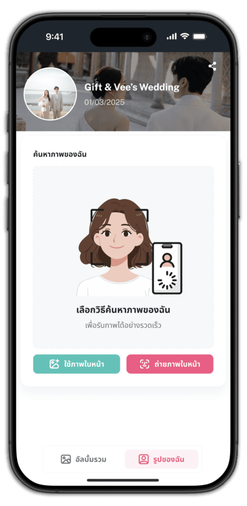 อัปโหลดรูปภาพและแชร์อัลบั้มให้แขกได้ง่ายๆผ่าน QR Code 📲 พร้อมฟีเจอร์สแกนใบหน้าด้วยระบบ AI 🔍🤳 สามารถค้นหารูปตัวเองได้ในพริบตา! และแชร์เป็นสไลด์โชว์แบบเรียลไทม์ได้ทันที